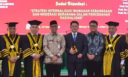 “Semoga gelar doktor ini menjadi berkah dan bermanfaat, terutama bagi Provinsi Lampung. Disertasinya sangat relevan karena membahas moderasi beragama dan pencegahan radikalisme serta terorisme. Mudah-mudahan kajian ini dapat menjadi referensi dalam menekan penyebaran paham radikal,” ujarnya.